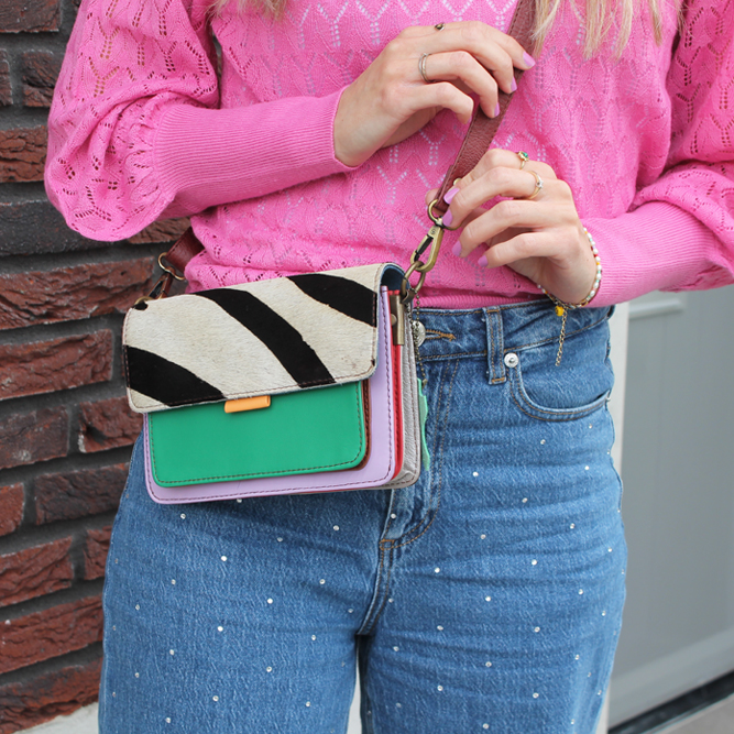 De Multicolor Mira bag is hetzelfde model als de Animal Mira bag, alleen bestaat dit model uit meer verschillende kleuren. De klep heeft een tof dierenprint “vachtje”. Ook dit model bestaat uit één vak met een ritsvakje aan de binnenkant én een extra vak aan de voorkant met drukknoop. Handig! Je telefoon, portemonnee, zonnebril, make-up en sleutels passen allemaal prima in dit model. Er zit een lang verstelbaar hengsel bij elke tas en dit model sluit ook weer met een drukknoop.