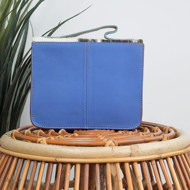 Tas Kamala – Roze / blauw / koeienprint | Leren dierenprint tas